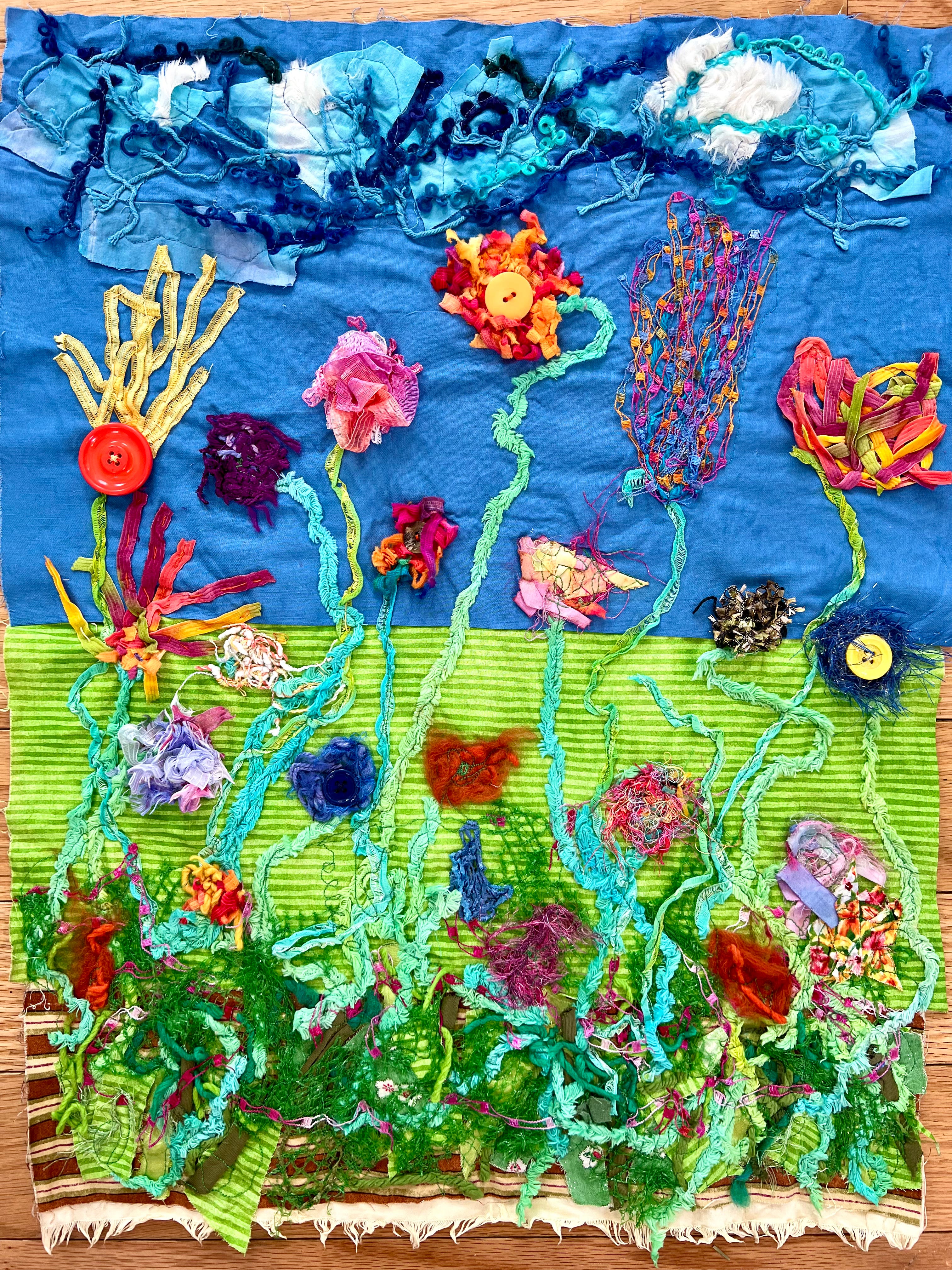 This child looks at my latest piece. She says, “Are trying to make this look like flowers from The Lorax?” (A Dr. Seuss book.)